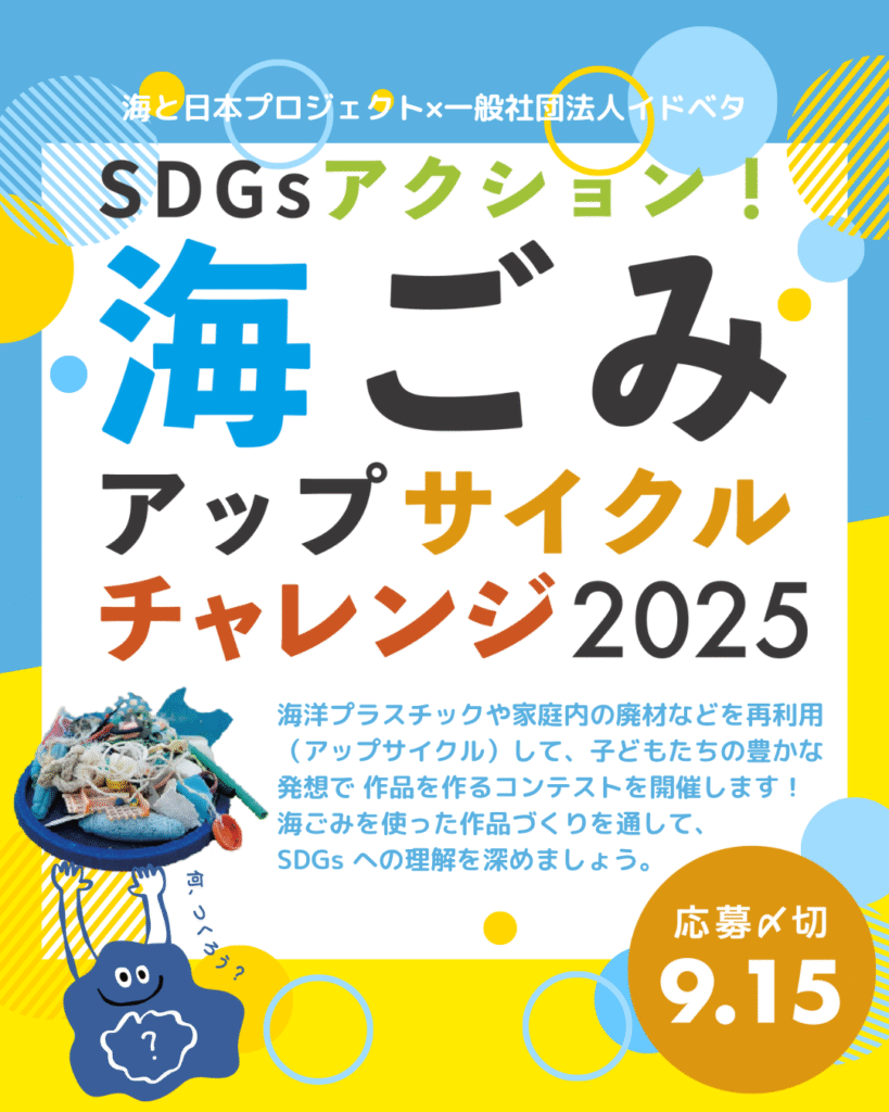 イドベタは「海と日本プロジェクト」と連携し、海洋プラスチックや身近な廃材を活用した作品づくり企画 『海ごみアップサイクルチャレンジ2025』 を開催します。子どもから大人まで、自由な発想でぜひご参加ください。